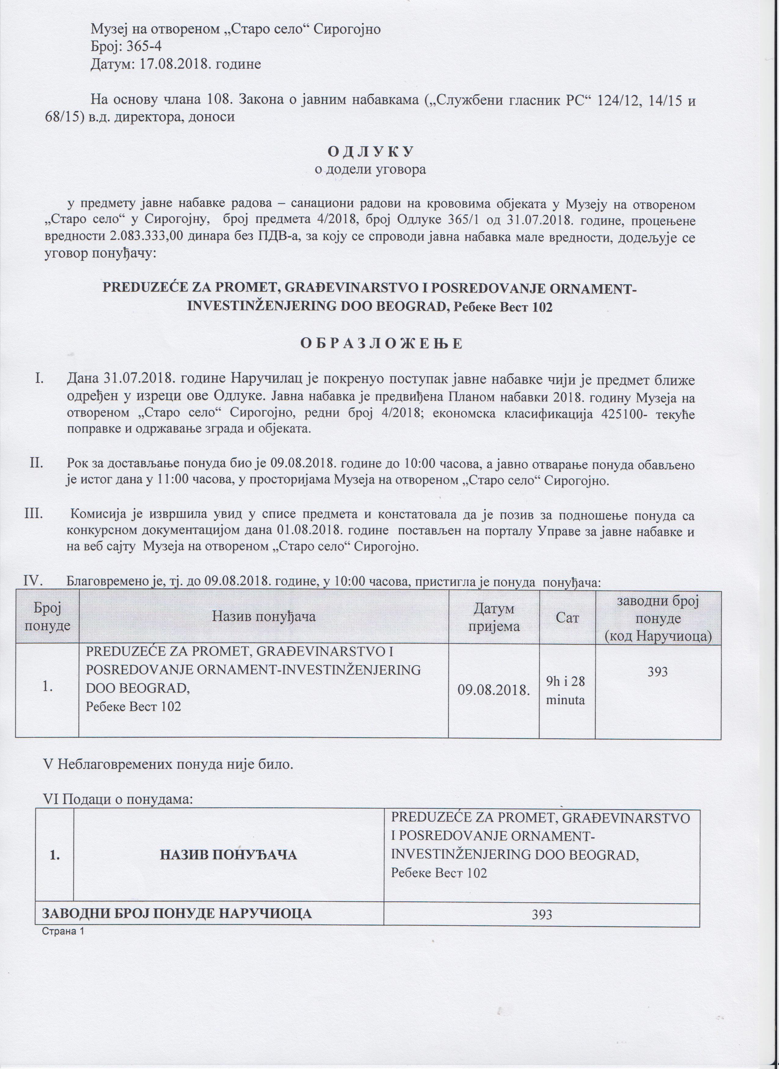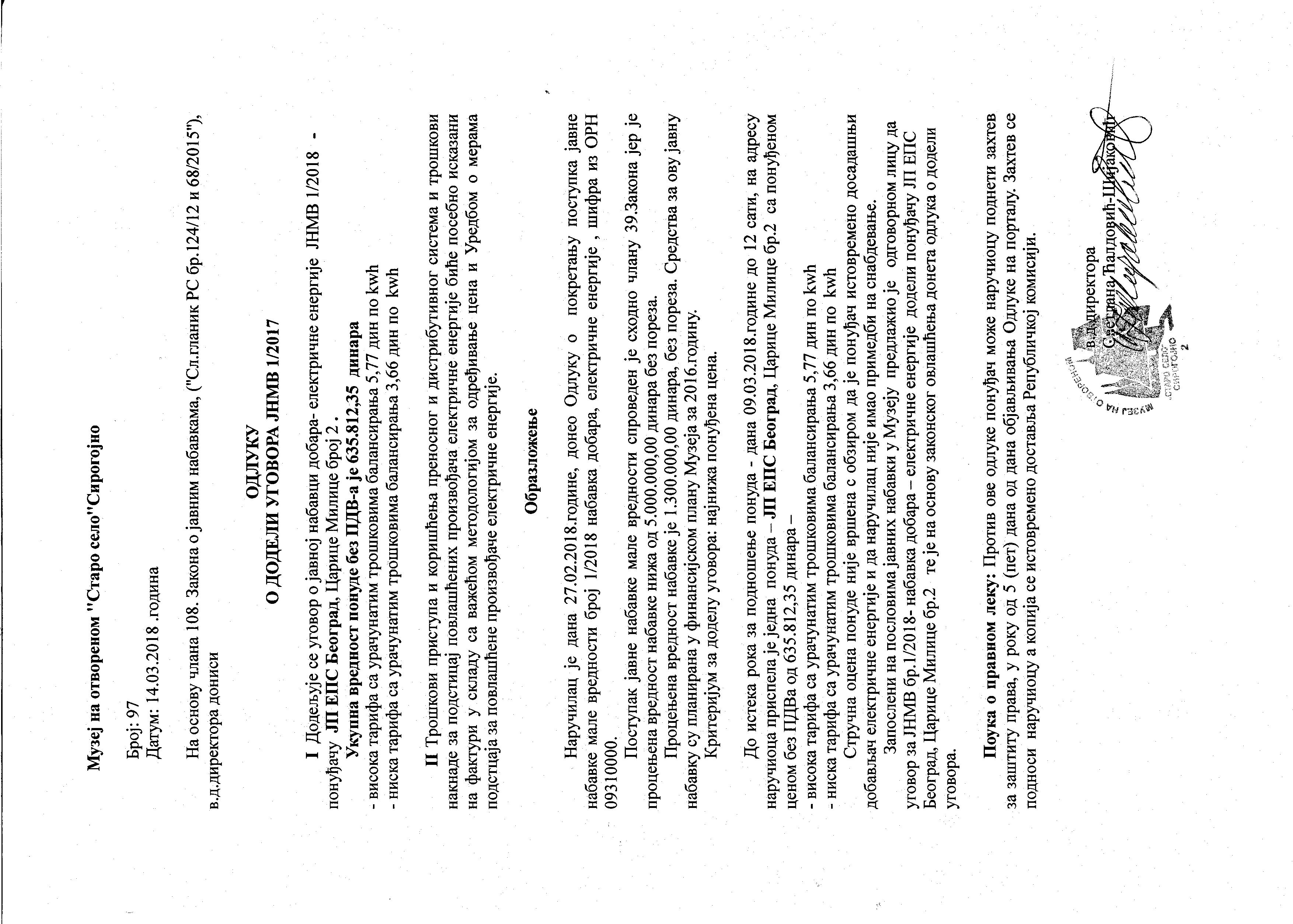 Одлука о додели уговора ЈНМВ 1/2018 Јавне набавке |