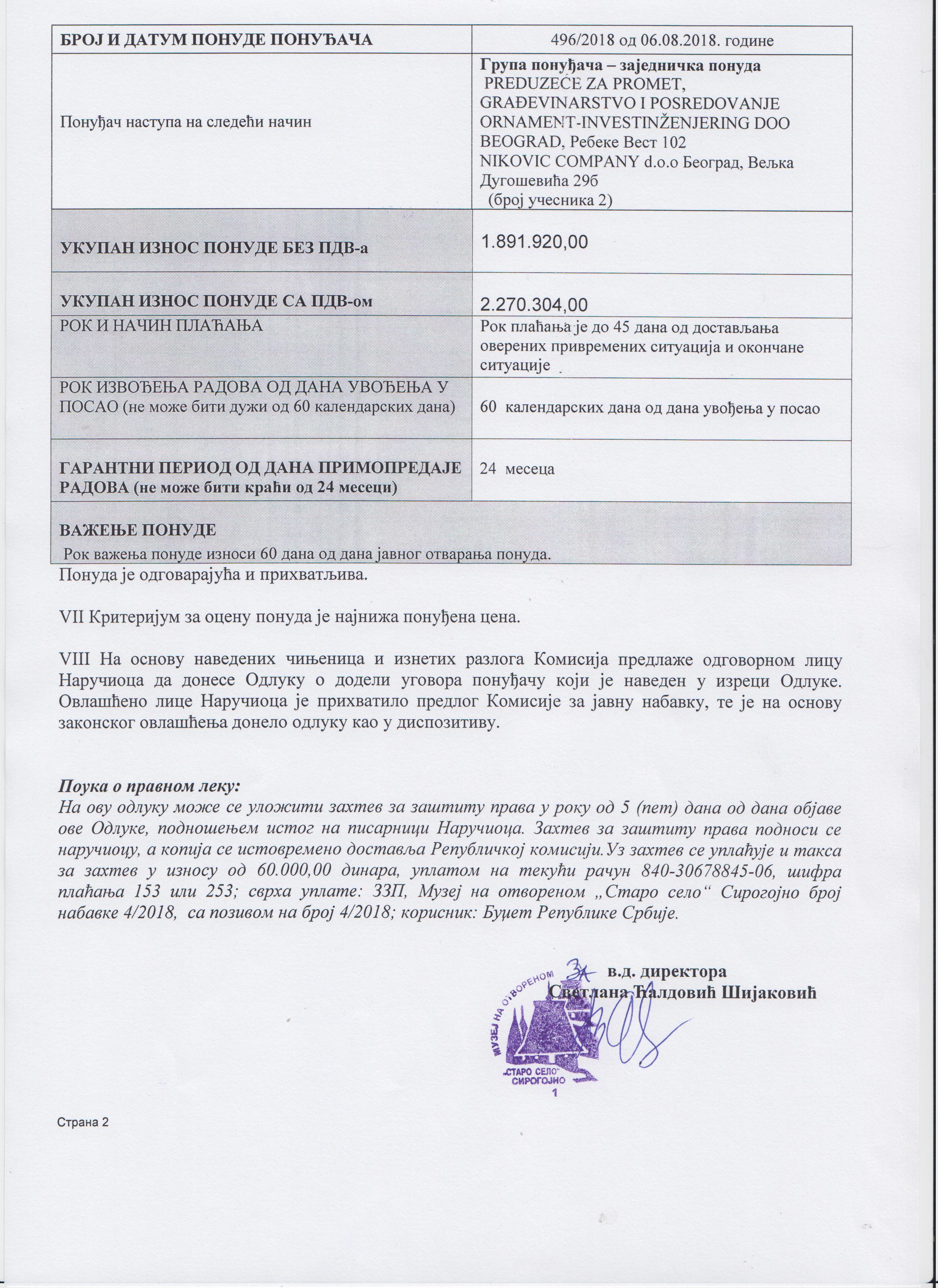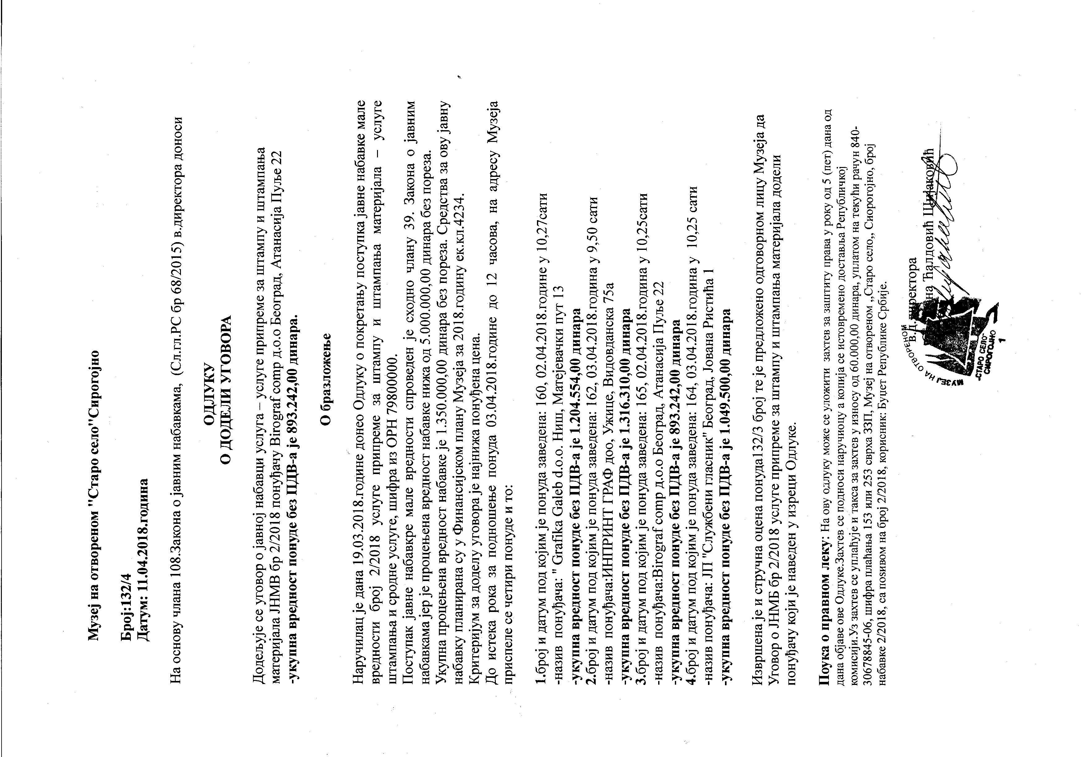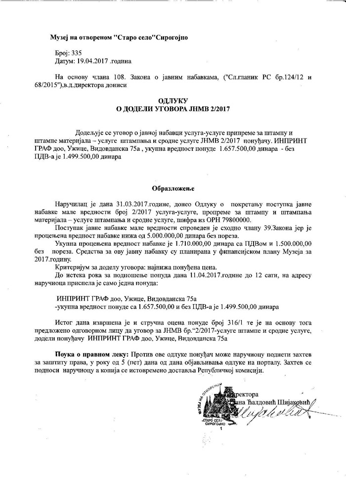 Одлука о додели Уговора ЈНМВ бр 2/2018 услуге штампе Јавне набавке |