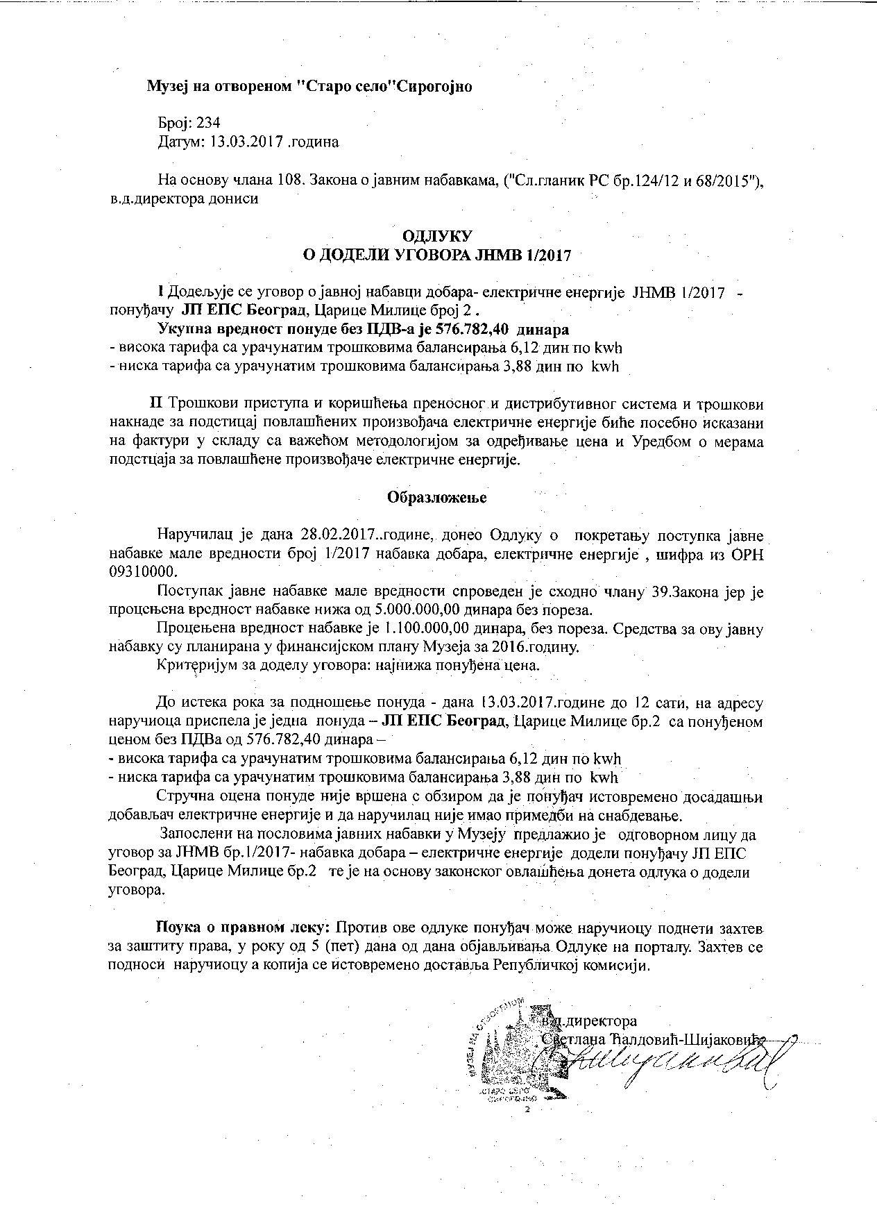 Одлука о додели уговора ЈНМВ 1/2017 Јавне набавке |