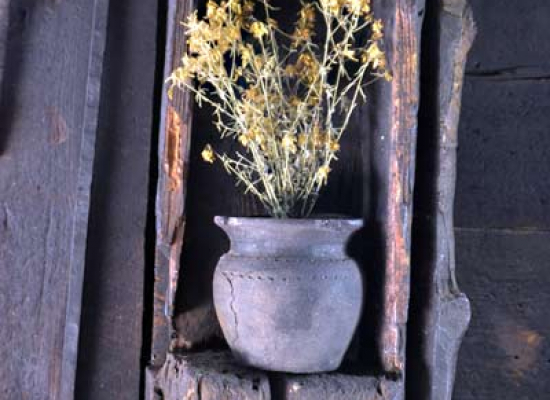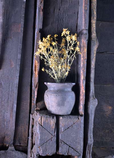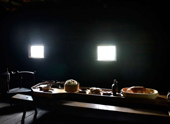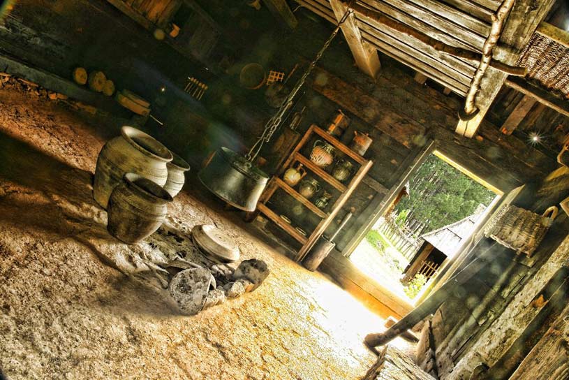 In the room of the main house there is a table of a specific form on which the festive meal is set. On other days it is packed and moved under the soffit on the south side of the house in order not to occupy space in the room. The room has interesting interior shutters on the window openings that do not have wings or glass, but are pulled to the side so that light and fresh air could enter the room.