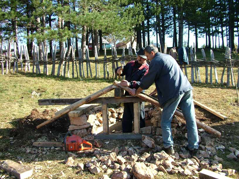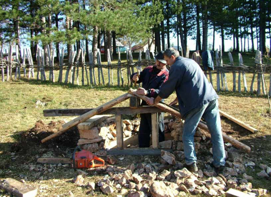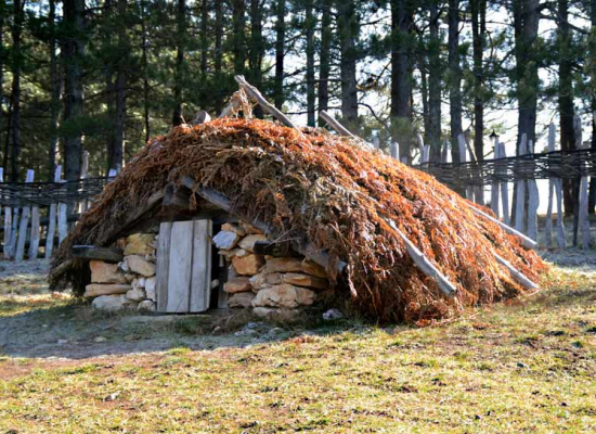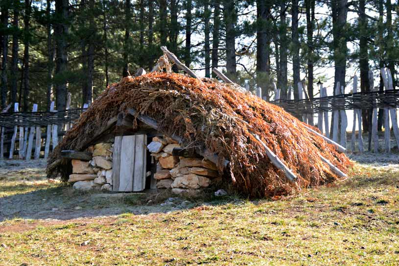 The root cellar was used to keep and store food during the winter. It was covered with straw or ferns and was half-buried in the ground. It was located near the main house in order to make easier use of it.