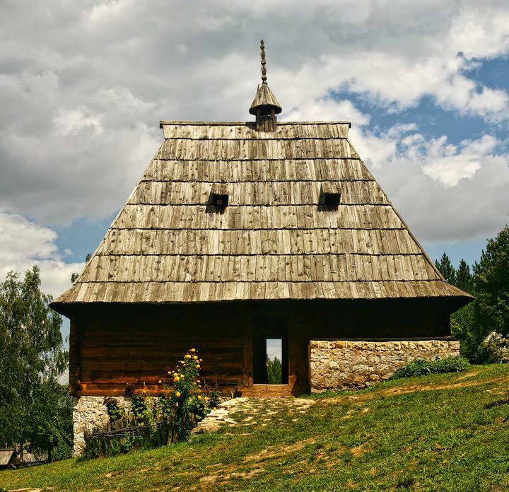 Главна кућа спада у тип динарске брвнаре. У основи је правоугаона и постављена на темељ од камена. Зидна платна чине брвна, тесане греде положене водоравно једна преко друге. На угловима је карактеристична веза у крст – ћерт. Кров је на четири воде, стрм и висок, покривен, сламом, даском – шиндром или каменом. На странама крова су отвори – баџе кроз које излази дим из куће. На средини крова је карактеристичан димњак – капић, купастог облика са изрезбареним вретеном на врху. На кући су прављена двоја врата, постављена једна наспрам других. Главна су била на источној страни.