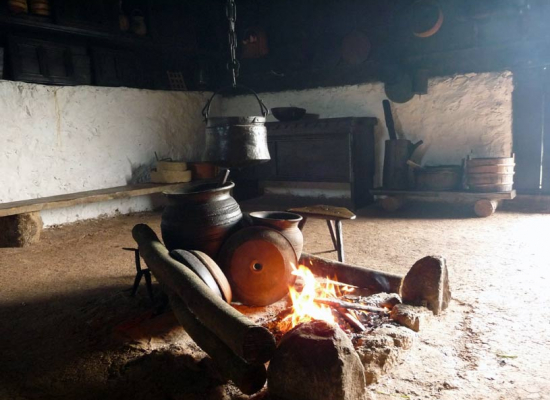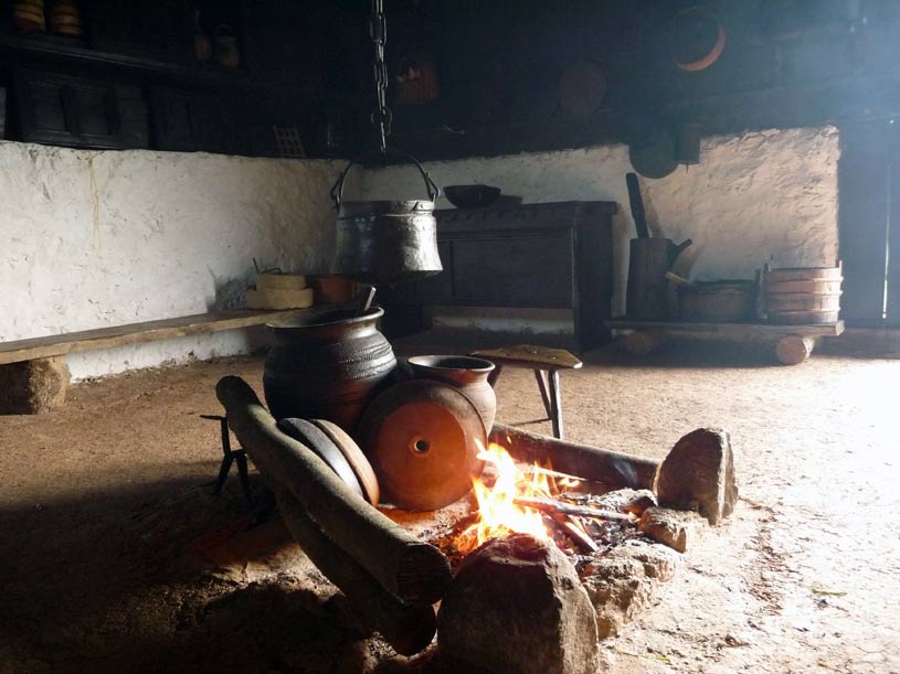Кућа је подељена на две просторије – ''кућу'' и собу. "Кућа" је без тавана и прозора, а под је од земље. Централно место ''куће'' је огњиште – четвртаста или кружна, каменом поплочана површина са два камена пријеклада (камени стубови висине око 35 – 40cm усађени на ивицама једне од краћих страна огњишта). На огњишту се припрема храна, око њега се свакодневно окупља многобројна задружна породица. Оно је и ритуално средиште куће, где се обављају најзначајнији породични ритуали и обреди везани за велике народне празнике.