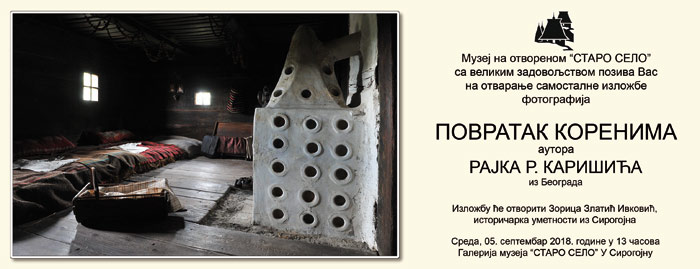 Музеј на отвореном "Старо село" Сирогојно са великим задовољством позива Вас на отварање самосталне изложбе фотографија "Повратак коренима", аутора Рајка. Р. Каришића из Београда.