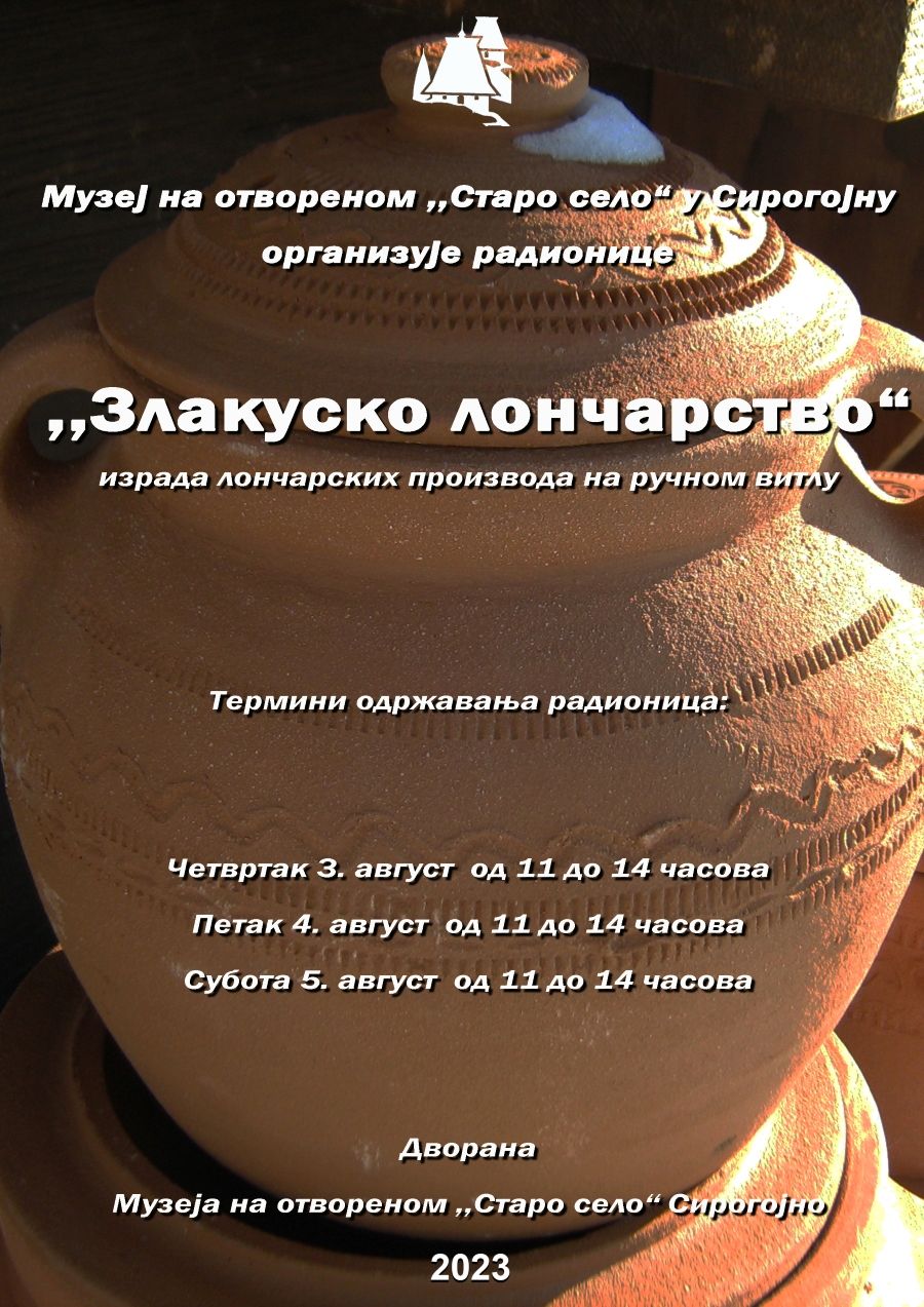 Радионица Злакуско лончарство Датум: 3 - 5 Aug 2023 Инфо / Стари занати / Посебни програми Радионице ,,Злакуско лончарство" израда лончарских производа на ручном витлу у Дворани Музеја од 3. до 5. августа 2023.године од 11 до 14 сати
