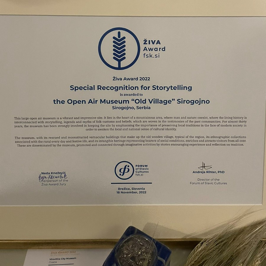 На осмој по реду ŽIVA AWARD 2022 додели награда која је одржана у Витешкој дворани Посавског музеја Брежице у Словенији, у конкуренцији 29 номинованих музејских установа из 9 земаља Музеј на отвореном ,,Старо село'' Сирогојно добитник је Признања за приповедање (Special recognitions for Storytelling).