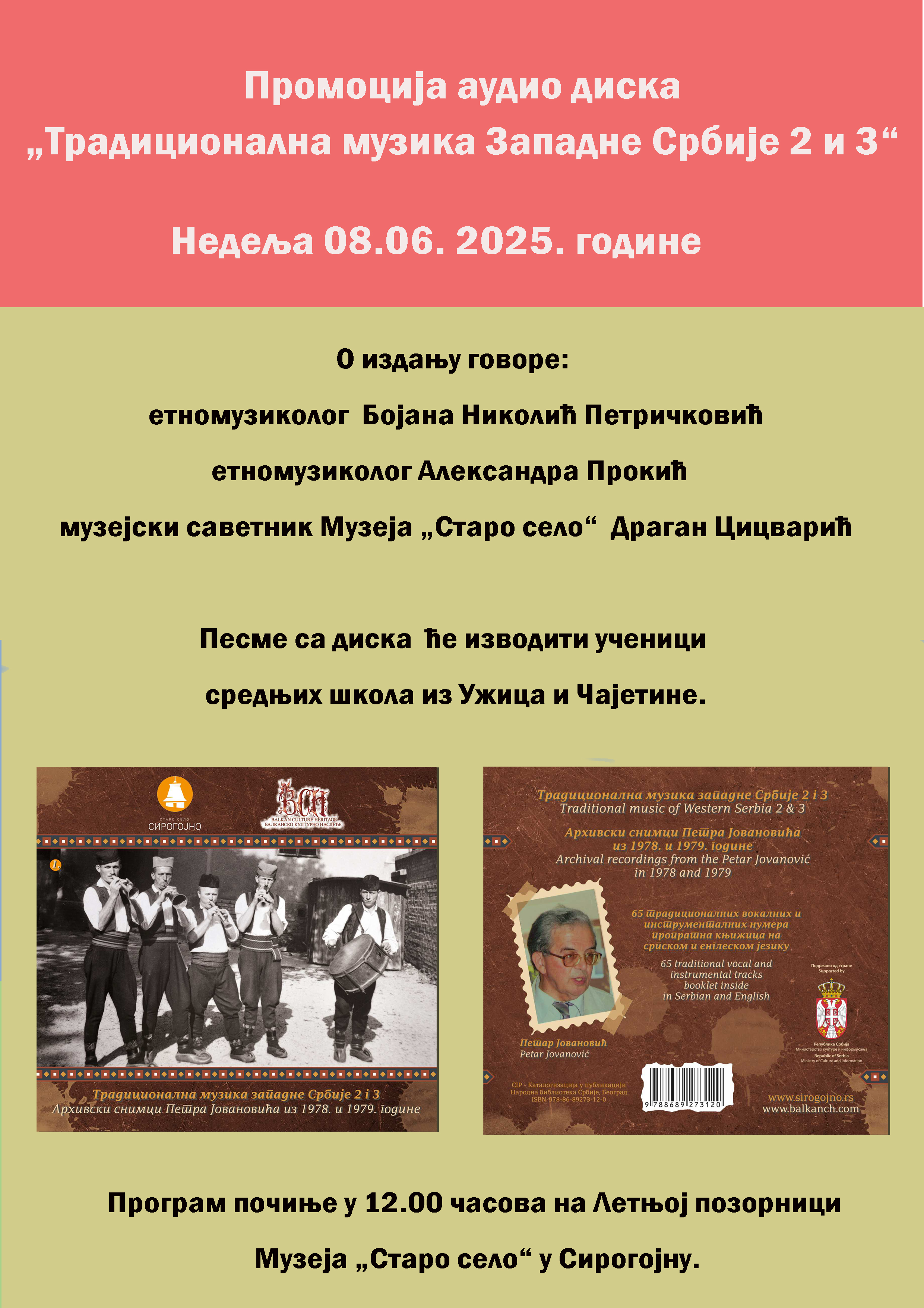 У недељу 08.06. 2025. године у Музеју на отвореном „Старо село“ у Сирогојну биће промовисан аудио ЦД „Традиционална музика Западне Србије 2 и 3“. На диску су забележене песмаме које је Петар Јовановић, новинар Радија Ужице, снимио на магнетофонским тракама 1978. и 1979. године  у селима ужичког и златиборског краја.