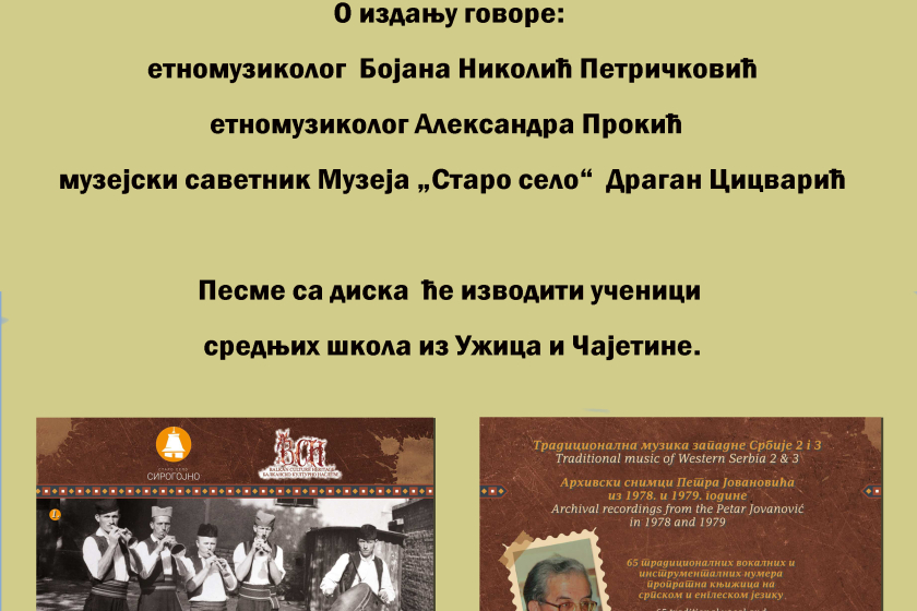 У оквиру промоције биће изведене и традиционалне песме са диска које ће отпевати ученици средњих школа из Ужица и Чајетине.
