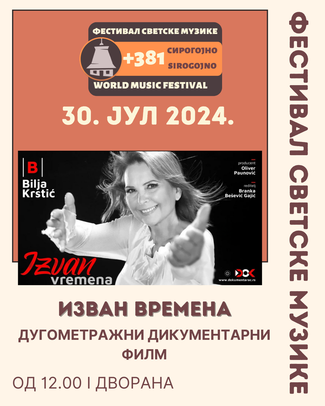 У посебном програмском сегменту, фестивал представља дугометражни документарни филм „Изван времена“, посвећен животу и раду Биље Крстић – једне од најзначајнијих интерпретаторки српске и балканске етно музике. Режију и сценарио потписује Бранка Бешевић Гајић, а филм кроз личне приче, музику и сведочанства пријатеља и сарадника осликава једну изузетну уметничку биографију.Након пројекције, публици ће се обратити Биља Крстић и продуцент филма Оливер Пауновић. Ово је прилика да се публика, у амбијенту етнолошке баштине, повежe са уметношћу која је временом постала њен заштитни знак.