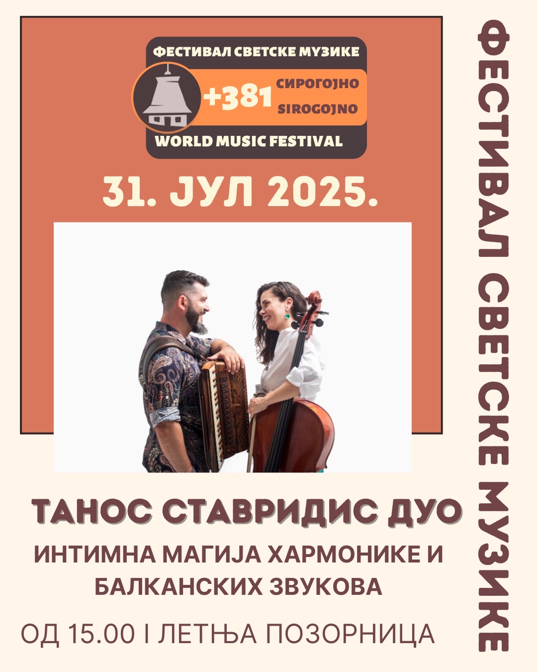 Хармоника и виолончело, у рукама врсних грчких уметника, стварају интимни музички свет пун страсти, меланхолије и медитеранске енергије. Танос и Стела воде публику на путовање кроз мелодије Балкана, оживљене модерним духом.Танос Ставридис, један од најпризнатијих хармоникаша Балкана, познат по свом виртуозном стилу и истраживању балканске народне музике, доноси јединствену музичку фузију кроз Дуо са Стелом. Уз спој хармонике и виолончела, истражују богатство балканских мелодија преплићући их са џез импровизацијом и савременим музичким изразом. У њиховој музици чују се утицаји не само грчког фолклора већ и других светских музичких традиција. Дуо ствара интимну атмосферу у којој хармоника преузима улогу приповедача, доносећи приче испуњене страшћу, носталгијом и енергијом.