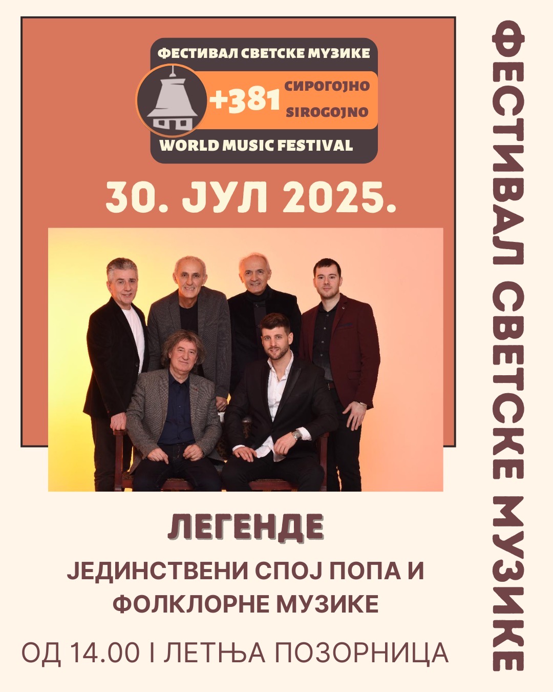 Њихове песме су део колективног сећања. Са преко три деценије каријере, бројним хитовима и препознатљивим стилом, Легенде ће публици приредити поподне испуњено љубављу, емоцијама и музичком елеганцијом. Српска група Легенде, основана 1988. године, препознатљива је по специфичном музичком стилу и хитовима који су постали неизоставни део сваке радио музичке емисије. Њихова музика представља спој попа и фолка, а текстови песама често говоре о љубави, емоцијама и животу, што их чини јединственим на сцени Србије и Балкана. Најлепше староградске песме настале су из пера Зорана Дашића, композитора, текстописца и аранжера, који оркестар води већ 38 година. Иза групе је велики број концерата, наступа на фестивалима, као и бројна признања за врхунски рад.