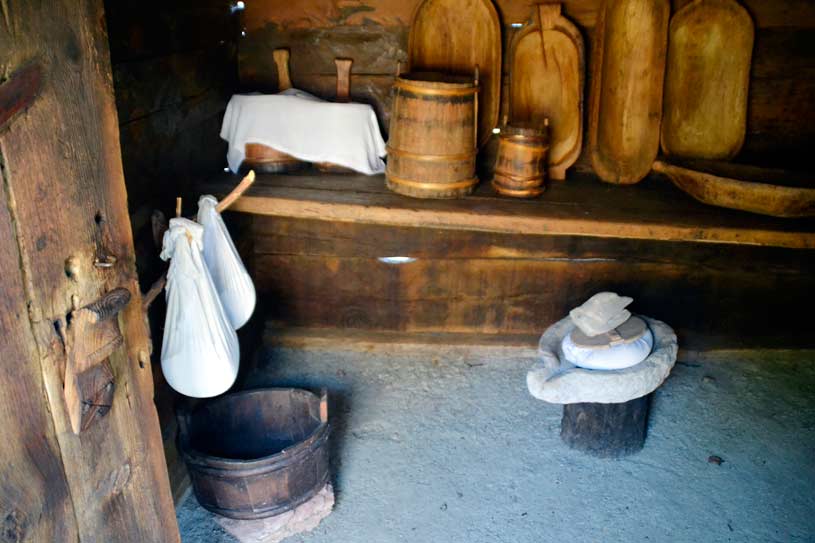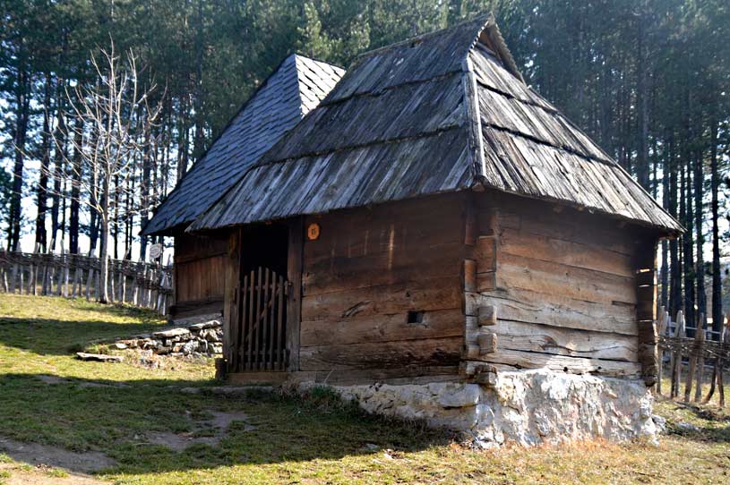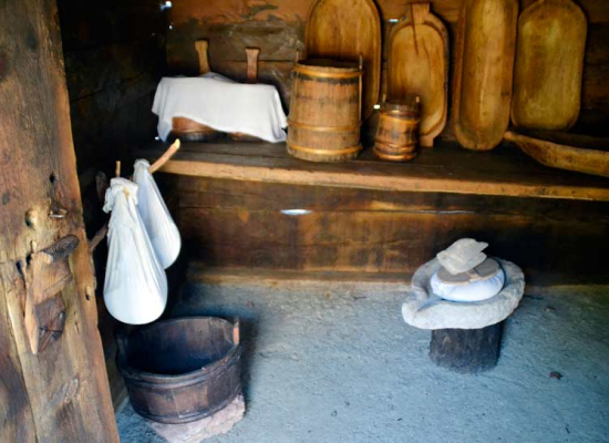 The dairy dates from 1925. It belonged to the family Bjeličić from Sirogojno. This cottage has been used exclusively for processing and storage of milk. Its interior was furnished with wooden shelves carrying special troughs (karlica) in which milk was poured to mature, wooden tubs for cheese storage and small barrels for keeping milk cream butter (kajmak). Only one woman (planinka) in the whole family was allowed into a dairy.