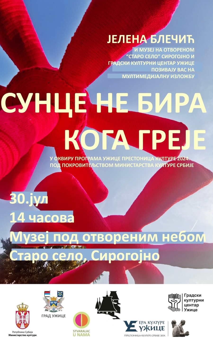 Пројекат ,, Сунце не бира кога греје“ утеловљује Јеленину визију универзалне љубави и егалитарног приступа, симболизован кроз сунце које неселективно обасјава све. Изложбену посебност чини џиновска скулптура у екстеријеру и мултимедијална поставка неочекиваних комбинација материјала и изведби, разиграни сплетови и визуелни конфликти скулптура, цртежа, слика, инсталација. Овај концепт врло вероватно побуђује посматрача да призове повезаност и непрекидну интеракцију између човека и природе, истичући суптилну лепоту која настаје у оваквом односу. Јелена Блечић у идиличном амбијенту Музеја ,,Старо село“ позива посетиоце да доживе уметност у симбиози уметност, природа, наслеђе. Јелена је учврстила медитативно густирање живота као есенцијалне нити водиље. Њени радови упорно говоре колико је радост озбиљна тема, она је збир свих збирова чији је крајњи резултат неподношљива лакоћа постојања.